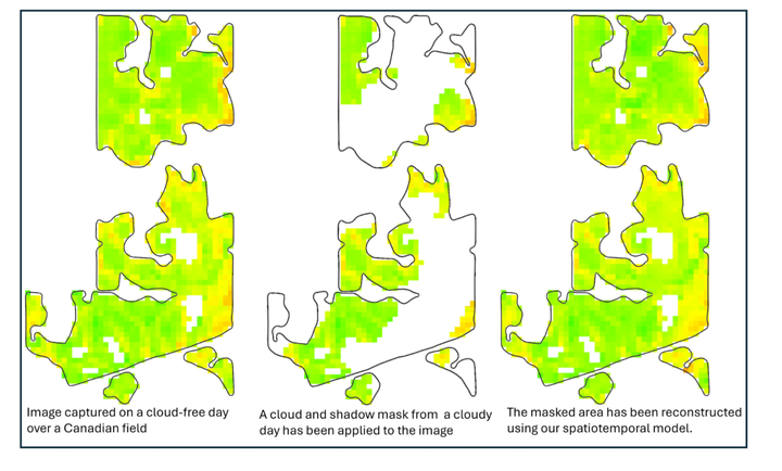One widely used method for analyzing vegetation growth from satellite imagery is the Normalized Difference Vegetation Index (NDVI), a key metric for assessing vegetation dynamics. NDVI varies not only spatially but also temporally, which is essential for analyzing vegetation health and growth patterns over time. High-resolution, cloud-free satellite images, particularly from publicly available sources like Sentinel, are ideal for this analysis. However, such images are not always available due to cloud and shadow contamination. To address this limitation, we propose a model that integrates both the temporal and spatial aspects of the data to approximate the missing or contaminated regions. In this method, we separately approximate NDVI using spatial and temporal components of the time-varying satellite data. Spatial approximation near the boundary of the missing data is expected to be more accurate, while temporal approximation becomes more reliable for regions further from the boundary. Therefore, we propose a model that leverages the distance transform to combine these two methods into a single, weighted model, which is more accurate than either method alone. We introduce a new decay function to control this transition. We evaluate our spatiotemporal model for approximating NDVI across 16 farm fields in Western Canada from 2018 to 2023. We empirically determined the best parameters for the decay function and distance-transform-based model. The results show a significant improvement compared to using only spatial or temporal approximations alone (up to a 263% improvement as measured by RMSE relative to the baseline). Furthermore, our model demonstrates a notable improvement compared to simple combination (up to 51% improvement as measured by RMSE) and Spatiotemporal Kriging (up to 28% improvement as measured by RMSE). Finally, we apply our spatiotemporal model in a case study related to improving the specification of the peak green day for numerous fields.